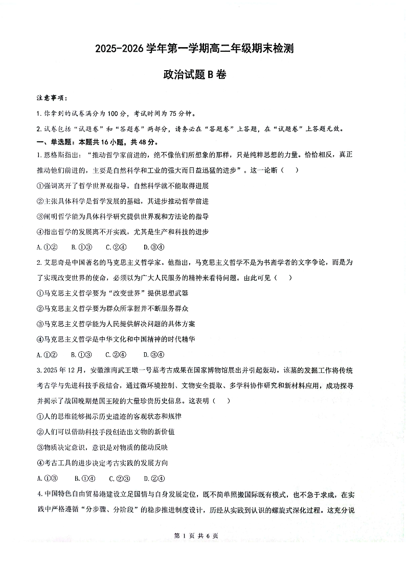高二政治--安徽省智学大联考·皖中名校联盟2025-2026学年高二上学期期末检测