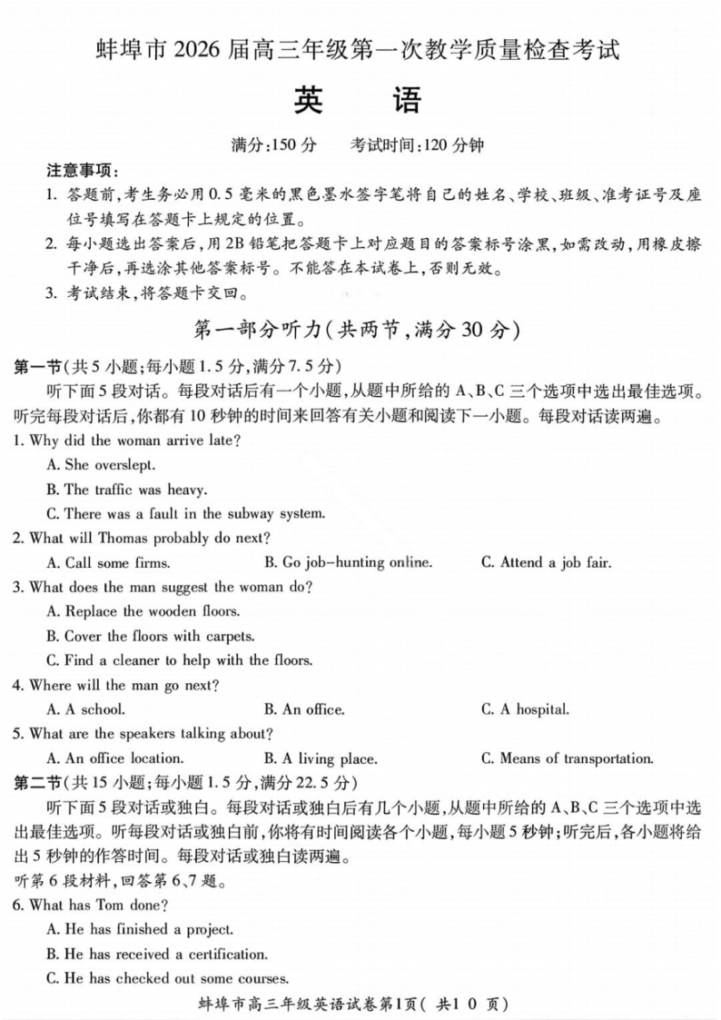 高三英语+答案--安徽蚌埠市2026届高三年级第第一次教学质量检查考试
