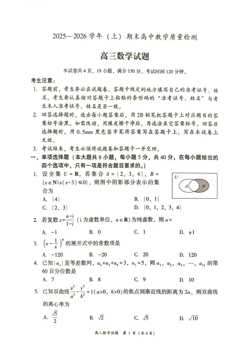 高三数学--福建省漳州市2026届高三上学期高中教学质量检测期末考试