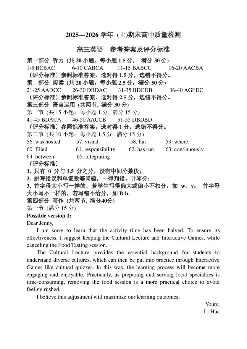 高三英语答案--福建省漳州市2026届高三上学期高中教学质量检测期末考试