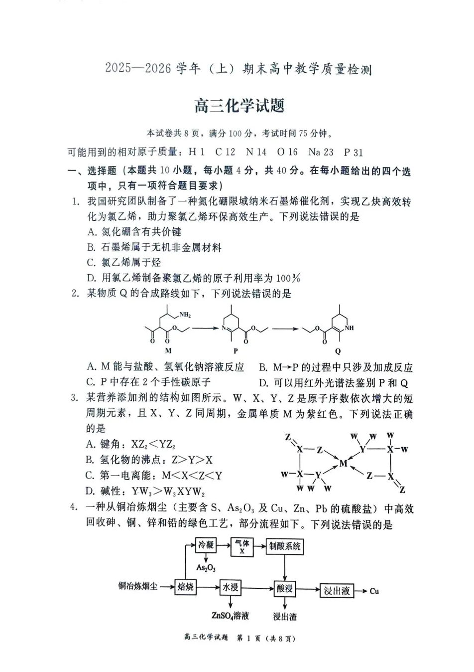 高三化学--福建省漳州市2026届高三上学期高中教学质量检测期末考试