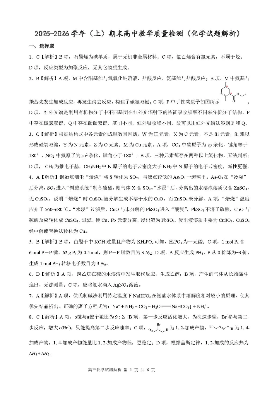 高三化学答案--福建省漳州市2026届高三上学期高中教学质量检测期末考试