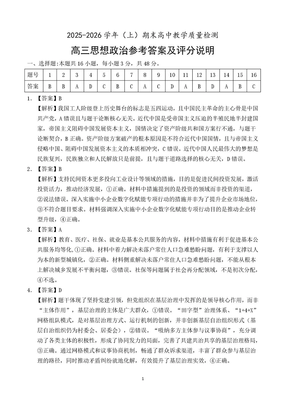 高三政治答案--福建省漳州市2026届高三上学期高中教学质量检测期末考试