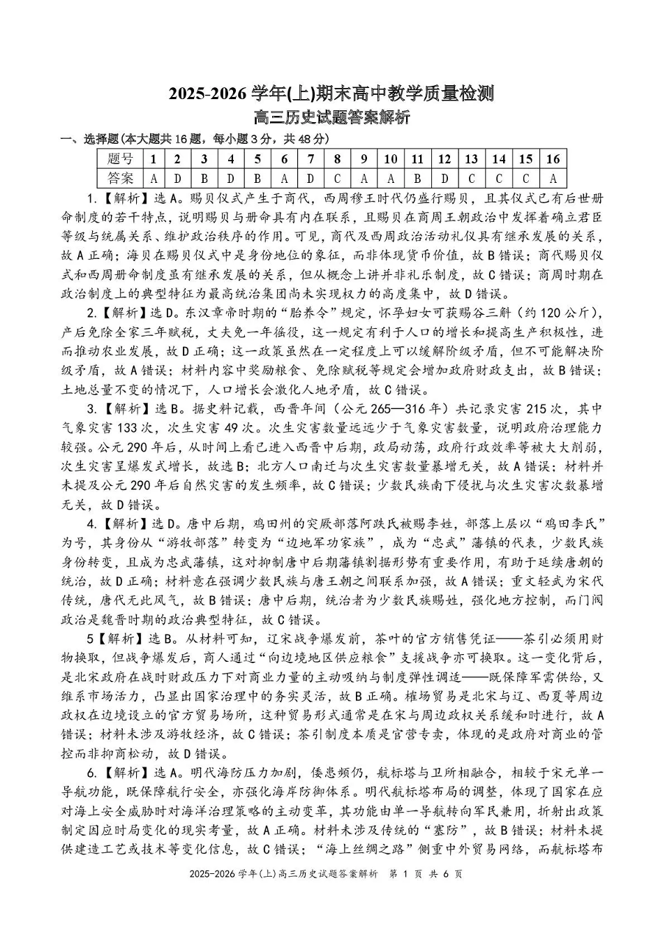 高三历史答案--福建省漳州市2026届高三上学期高中教学质量检测期末考试