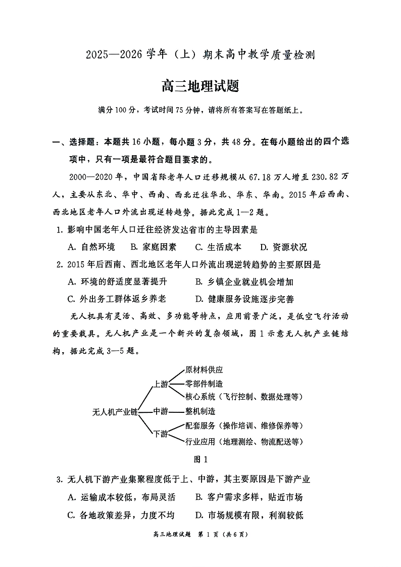 高三地理--福建省漳州市2026届高三上学期高中教学质量检测期末考试