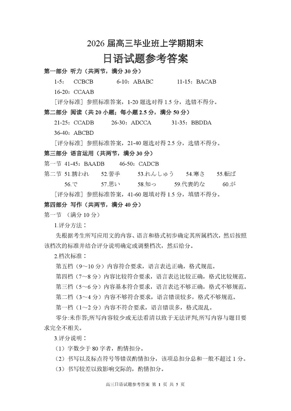 高三日语答案--福建省漳州市2026届高三上学期高中教学质量检测期末考试