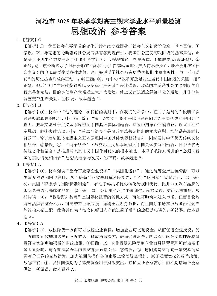 高三政治答案--广西河池市2026届高三上学期期末学业水平质量检测