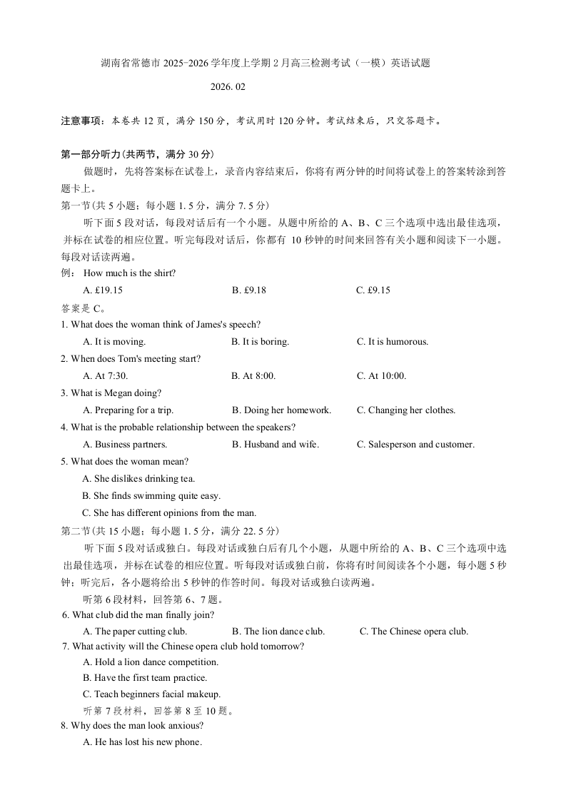 高三英语+答案--湖南省常德市2026届高三上学期2月期末检测考试