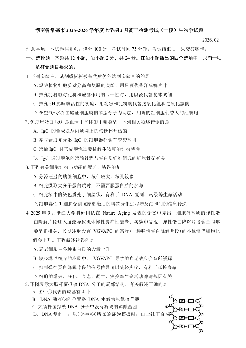 高三生物+答案--湖南省常德市2026届高三上学期2月期末检测考试