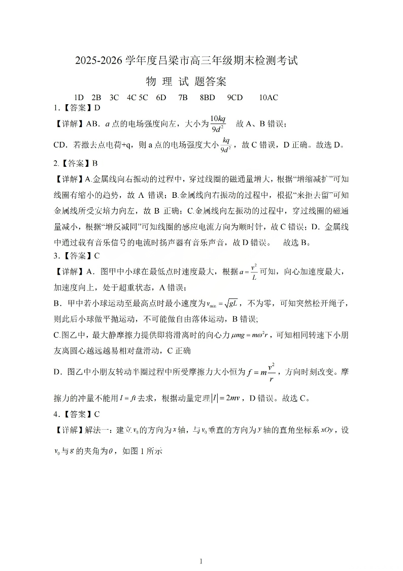 高三物理答案--山西省吕梁2026届高三上学期1月期末调研