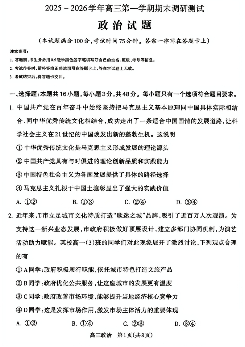高三政治--山西省吕梁2026届高三上学期1月期末调研