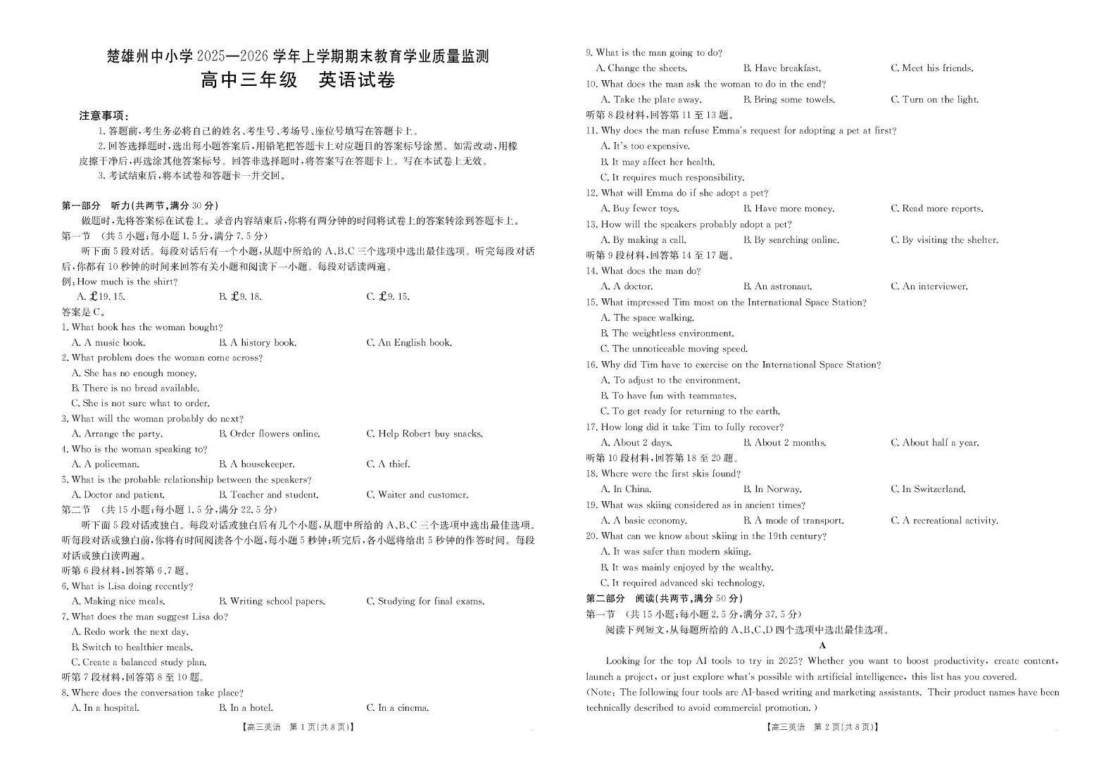 高三英语--云南省楚雄州2026届高三上学期1月期末教育学业质量监测