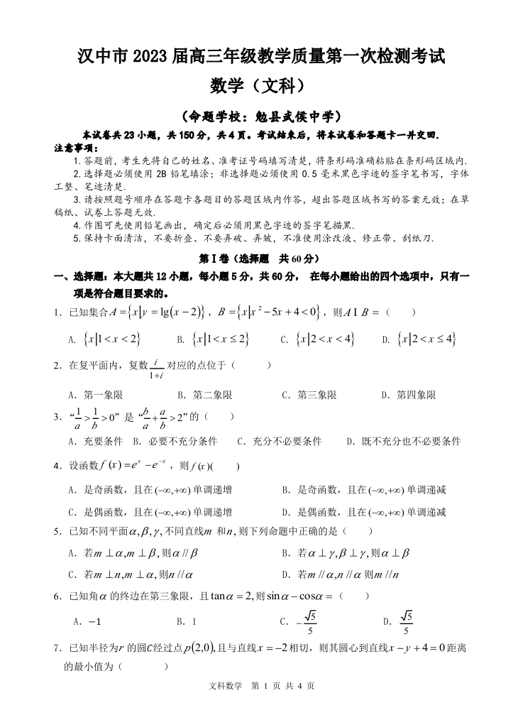 高三数学(文科)--陕西省汉中市2023高三教学质量第一次检测考试