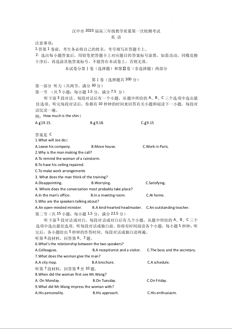 高三英语+答案--陕西省汉中市2023高三教学质量第一次检测考试