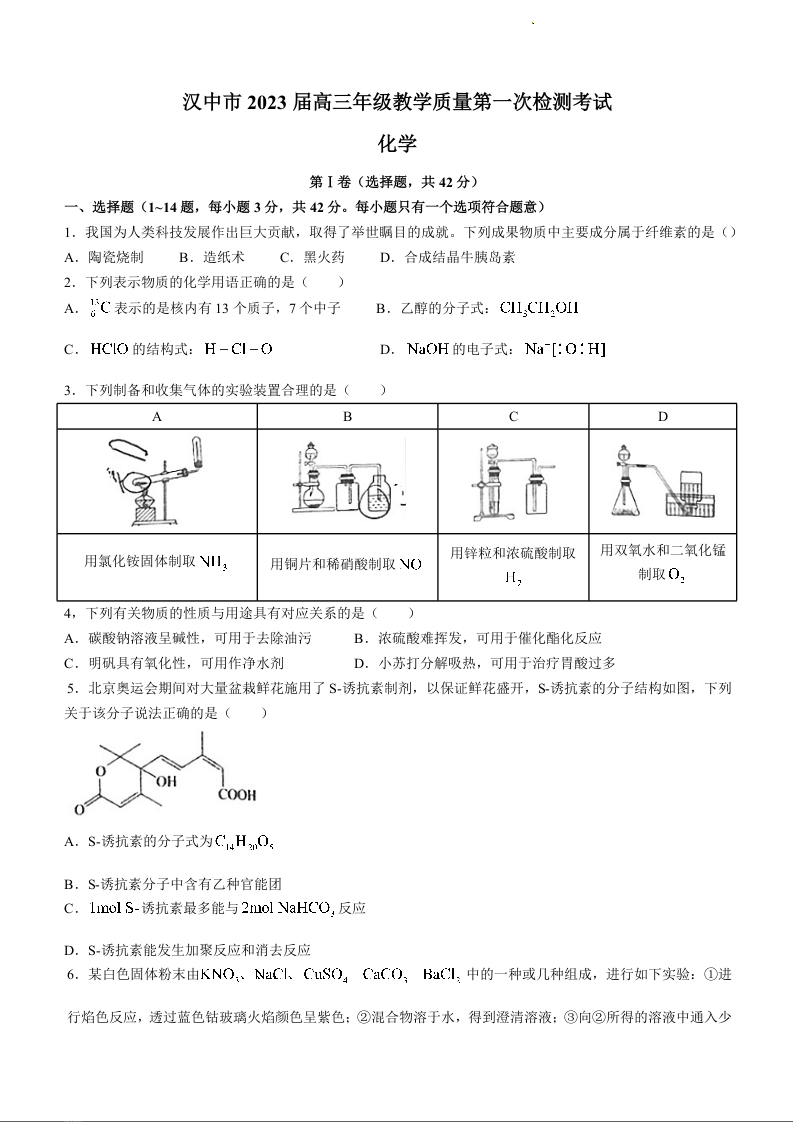 高三化学--陕西省汉中市2023高三教学质量第一次检测考试