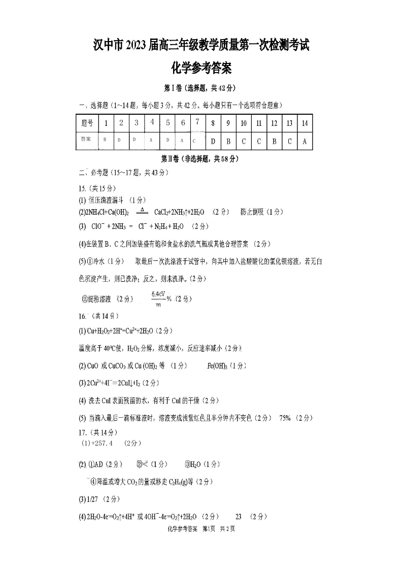 高三化学答案--陕西省汉中市2023高三教学质量第一次检测考试