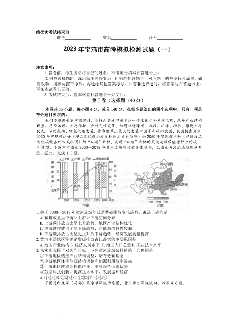 高三文综--陕西省宝鸡市2022-2023学年高三上学期高考模拟检测(一)