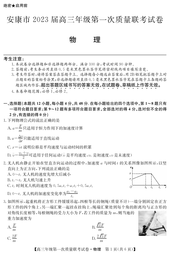 高三物理--陕西省安康市2023届高三上学期第一次质量联考(一模)