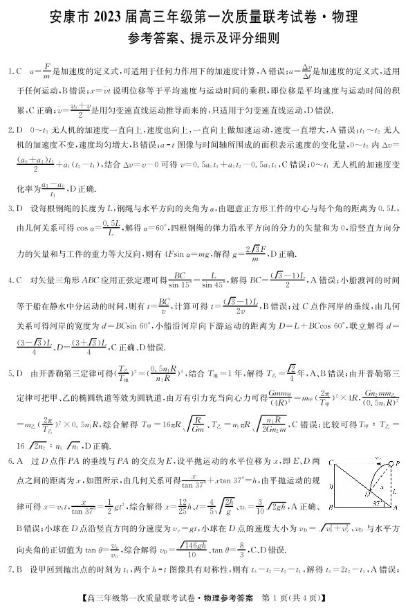高三物理答案--陕西省安康市2023届高三上学期第一次质量联考(一模)