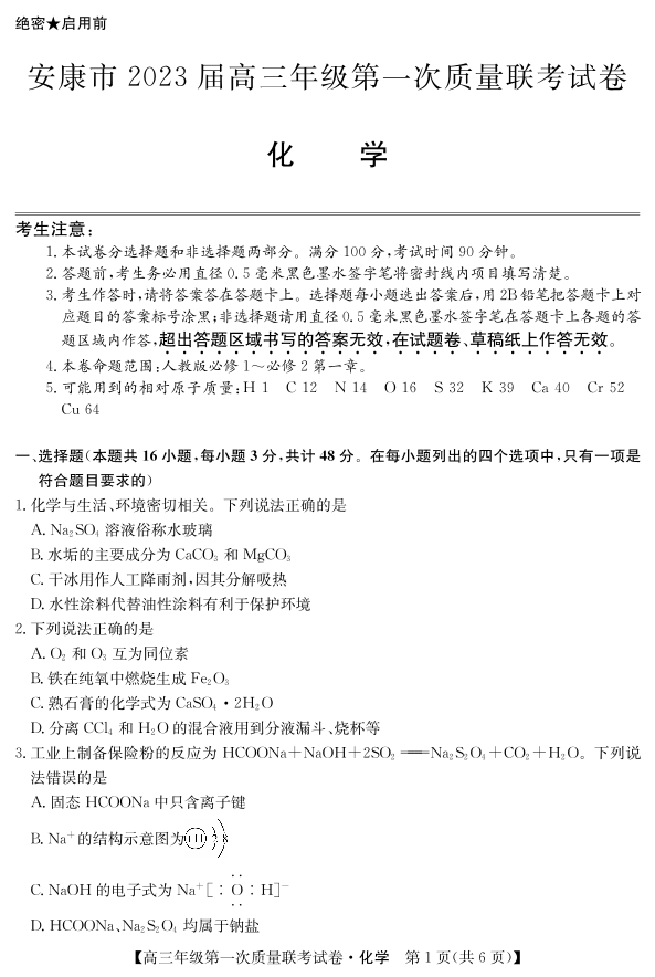 高三化学--陕西省安康市2023届高三上学期第一次质量联考(一模)