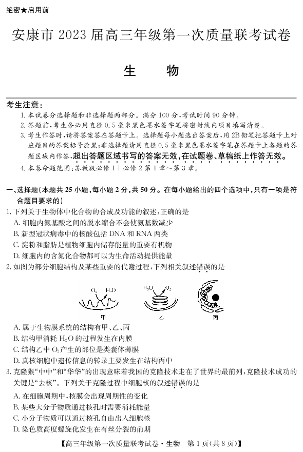 高三生物--陕西省安康市2023届高三上学期第一次质量联考(一模)