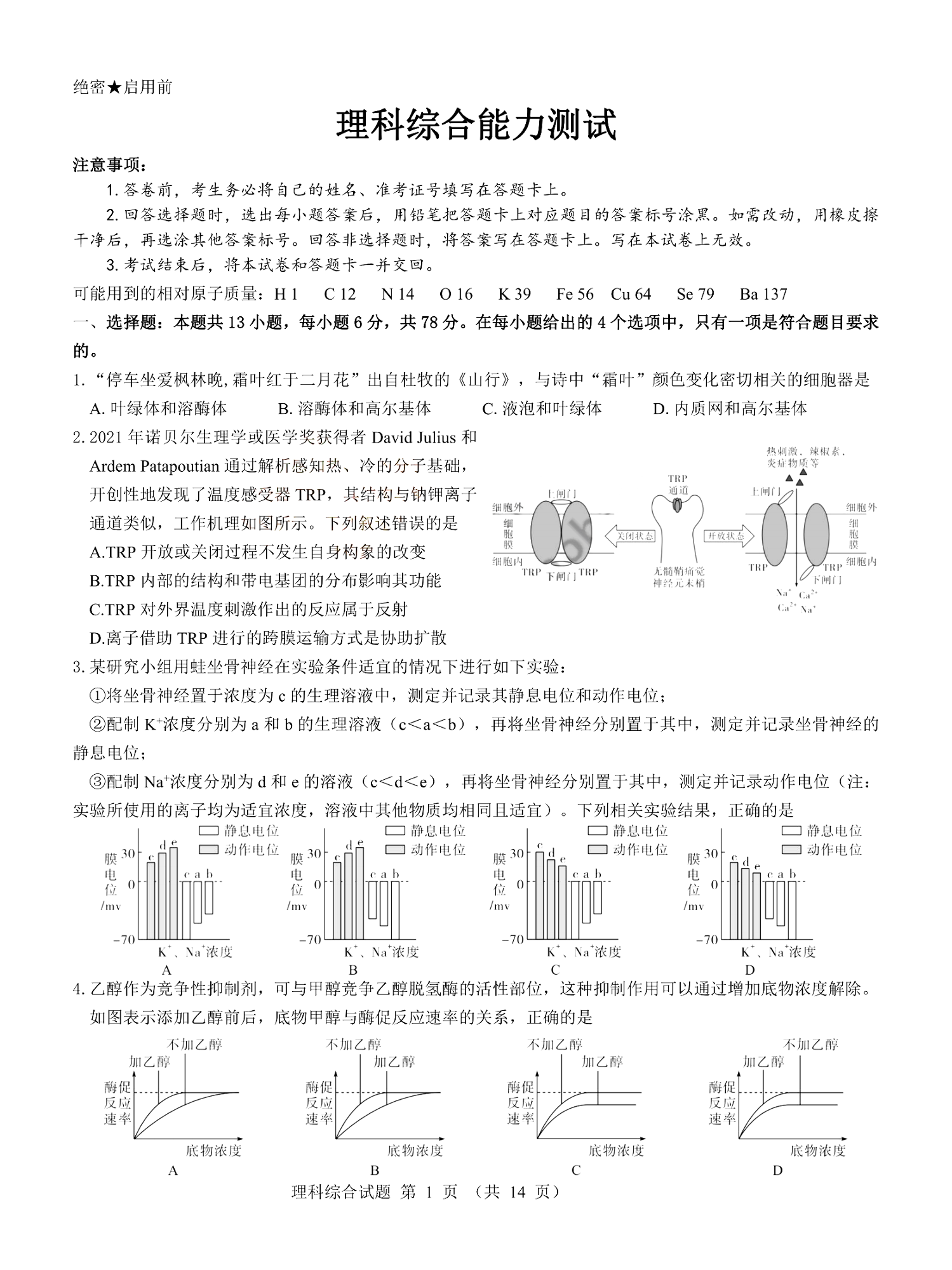 高三理科综合--山西省三重教育2022-2023学年高三上学期12月联考