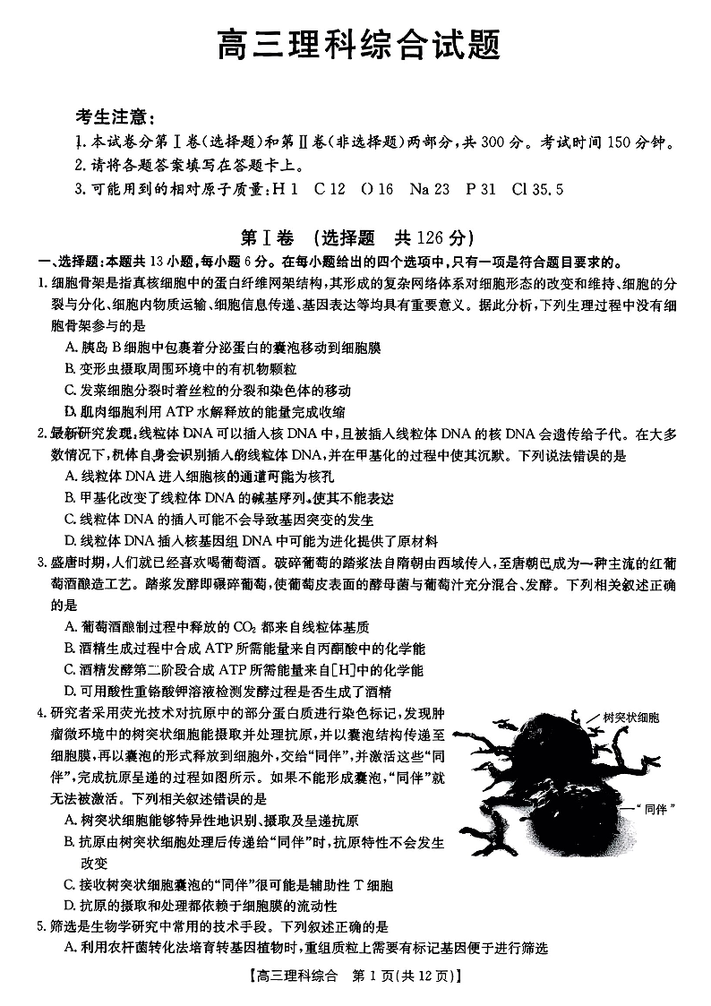 高三理综--山西省部分学校2022-2023学年高三上学期12月联考