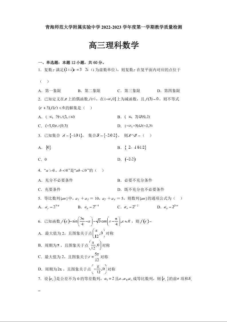 高三理科数学+答案--青海省西宁市青海师范大学附属实验中学2023高三上学期12月月考