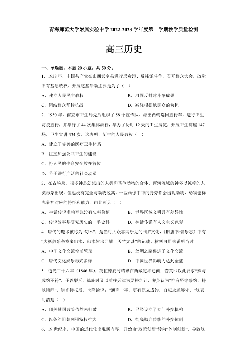 高三历史+答案--青海省西宁市青海师范大学附属实验中学2023高三上学期12月月考