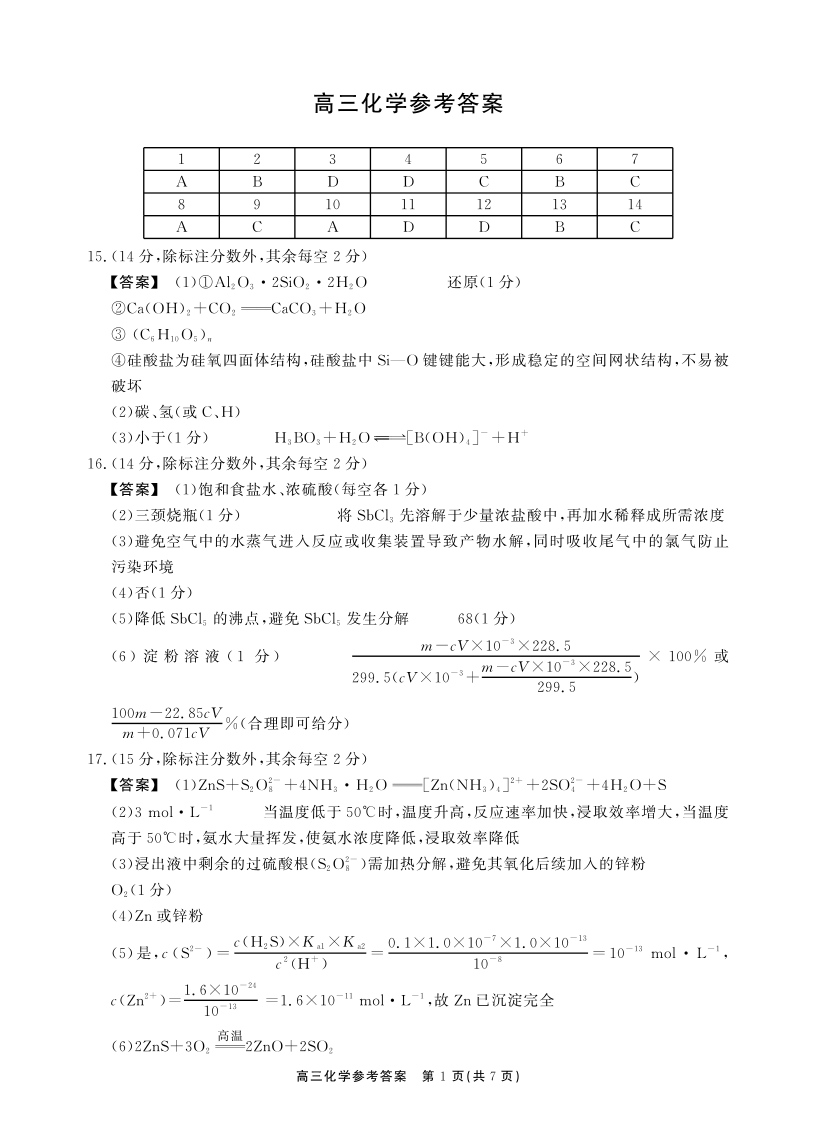 高三化学答案--安徽省鼎尖联考2026届高三上学期期末过程性学科素质评价
