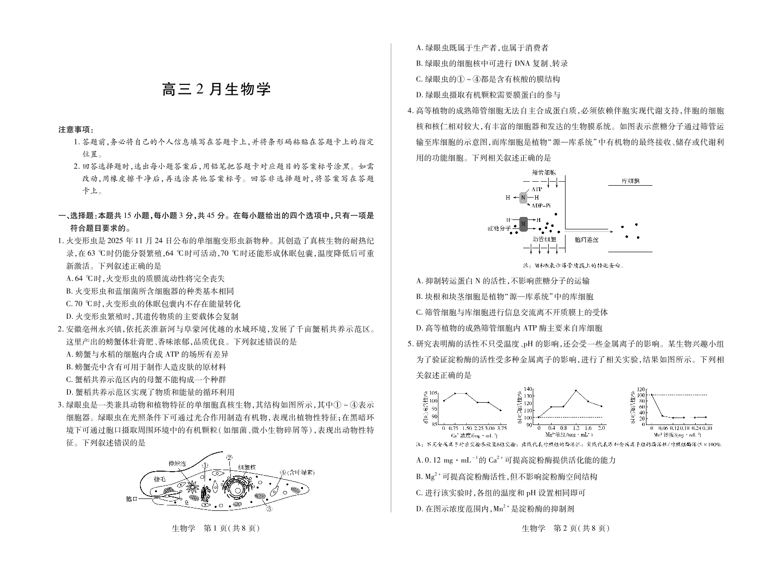 高三生物--安徽省毫州市普通高中2026届第一学期高三期末质量检测