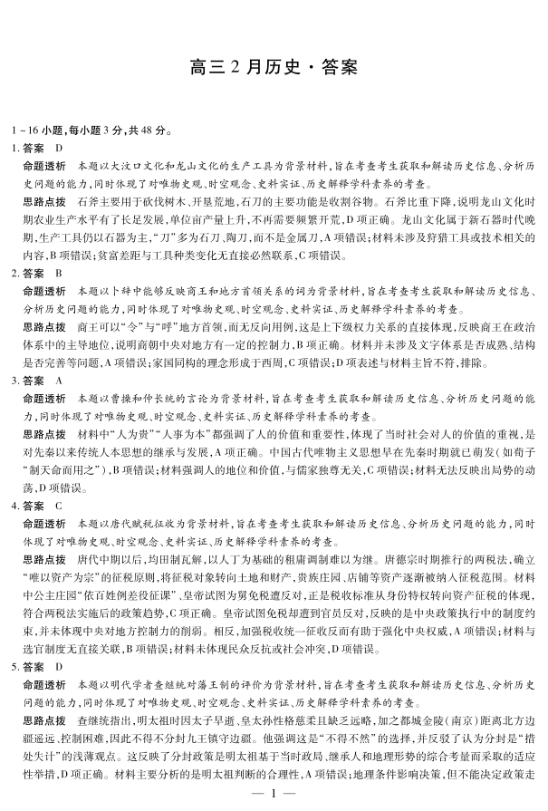 高三历史答案--安徽省毫州市普通高中2026届第一学期高三期末质量检测
