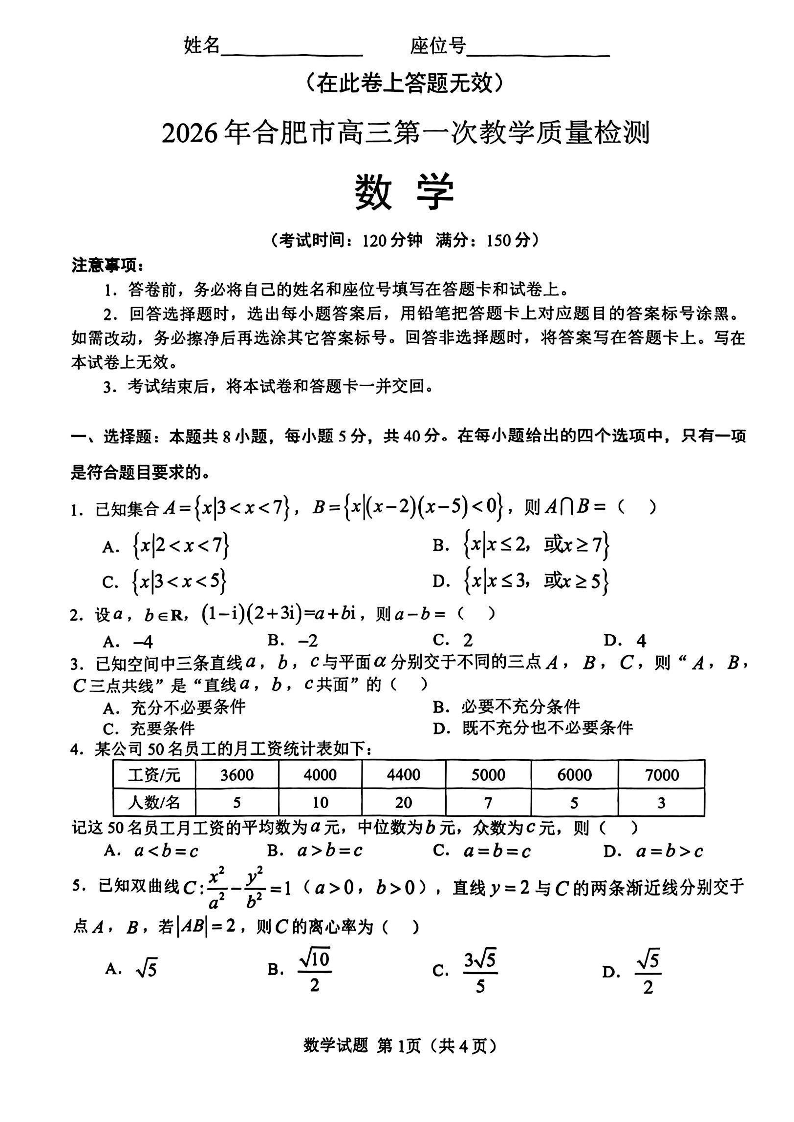 高三数学--安徽省合肥市2026届高三上学期第一次教学质量检测