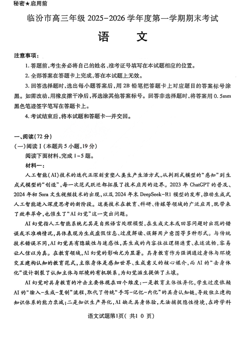 高三语文--山西省临汾市高三年级2026届度第一学期期末考试