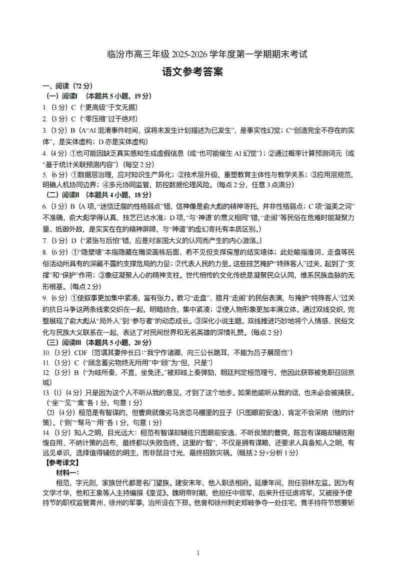 高三语文答案--山西省临汾市高三年级2026届度第一学期期末考试