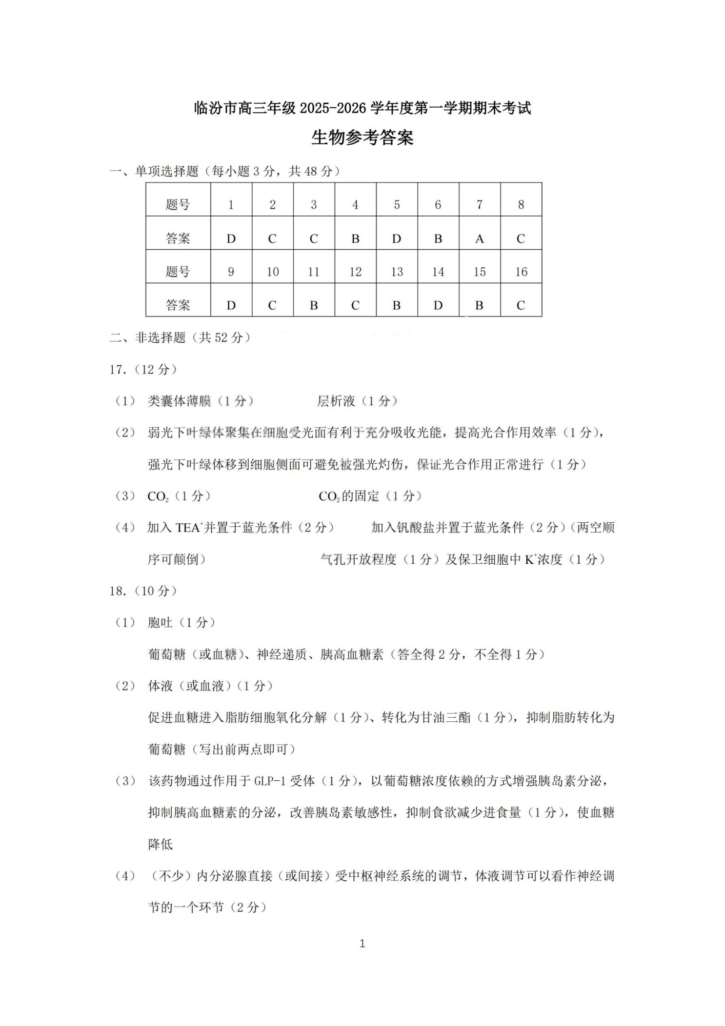 高三生物答案--山西省临汾市高三年级2026届度第一学期期末考试