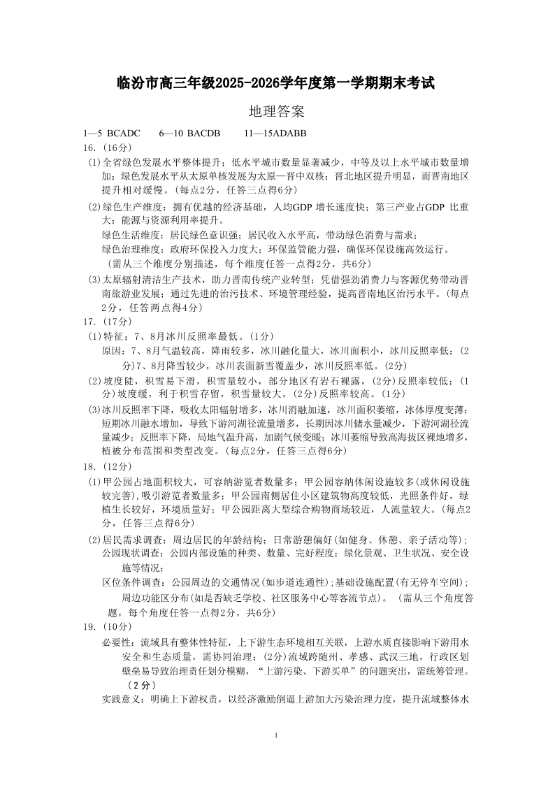 高三地理答案--山西省临汾市高三年级2026届度第一学期期末考试