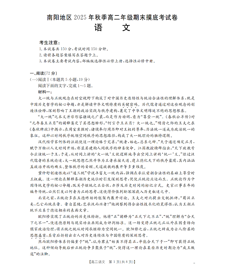 高二语文--河南省南阳地区2025-2026学年高二上学期期末摸底考试