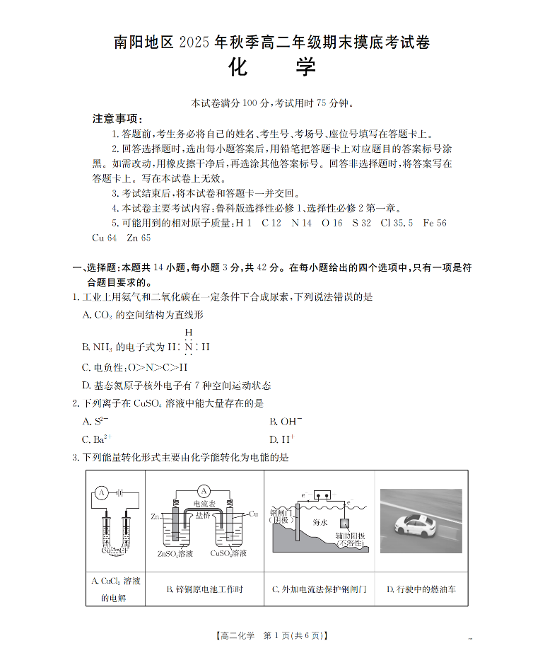 高二化学--河南省南阳地区2025-2026学年高二上学期期末摸底考试