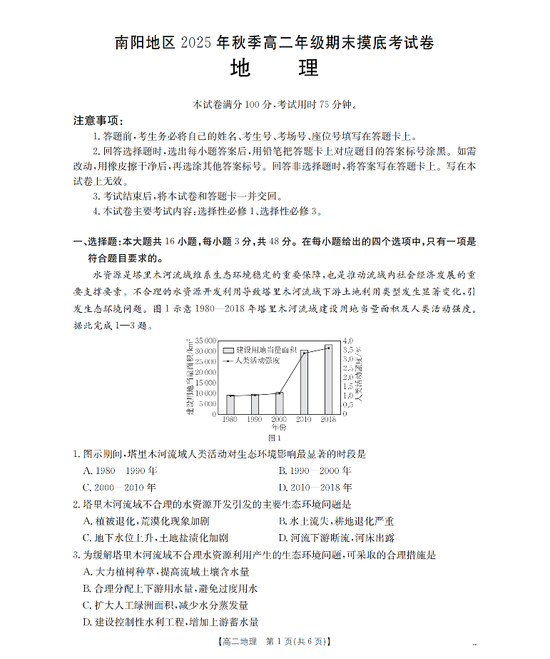 高二地理--河南省南阳地区2025-2026学年高二上学期期末摸底考试
