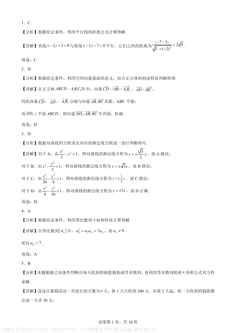 高二数学答案--内蒙古巴彦淖尔市2025-2026学年高二上学期期末考试