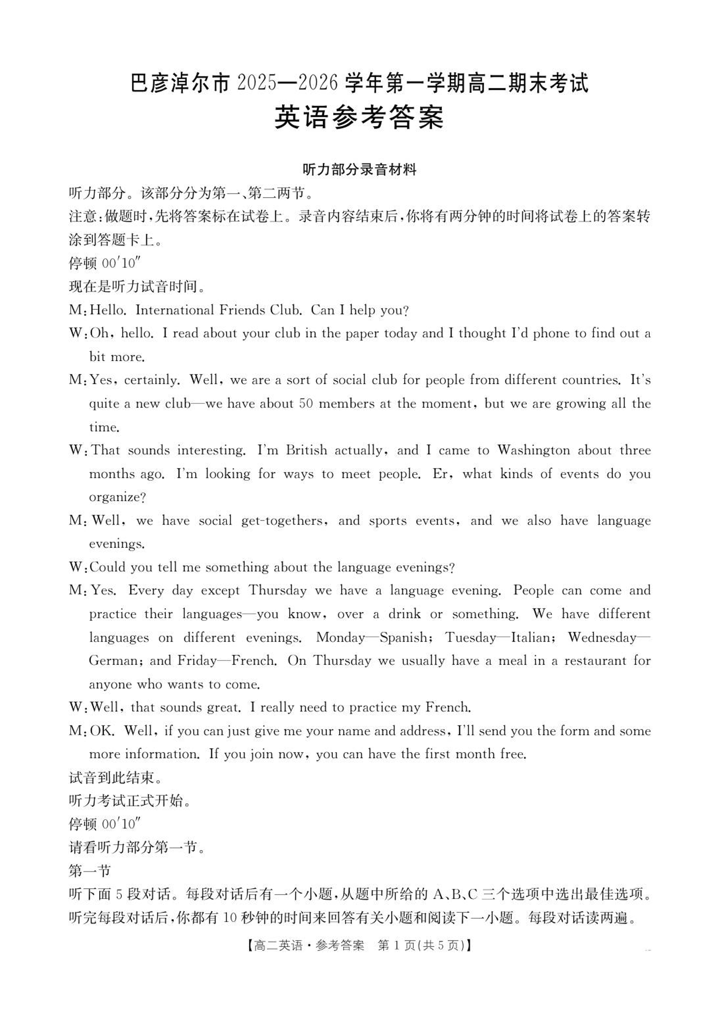 高二英语答案--内蒙古巴彦淖尔市2025-2026学年高二上学期期末考试