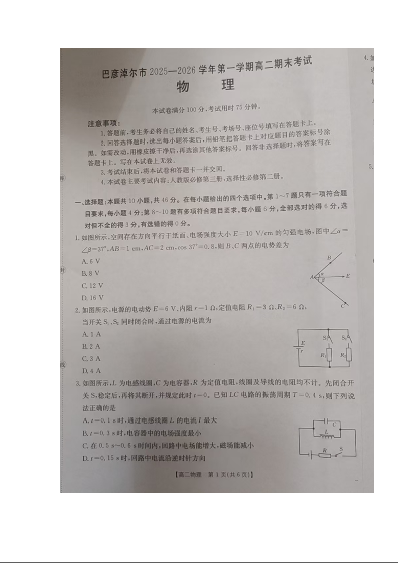 高二物理--内蒙古巴彦淖尔市2025-2026学年高二上学期期末考试
