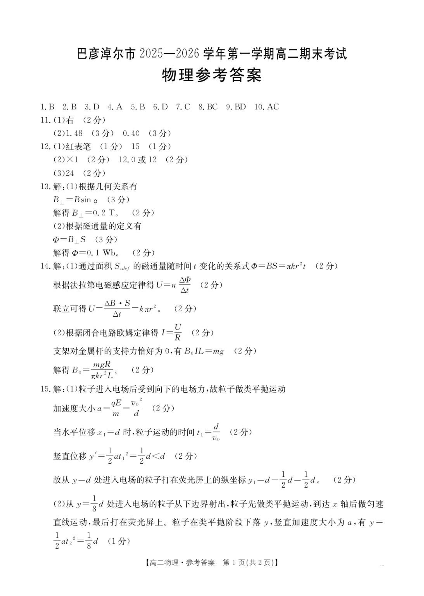 高二物理答案--内蒙古巴彦淖尔市2025-2026学年高二上学期期末考试