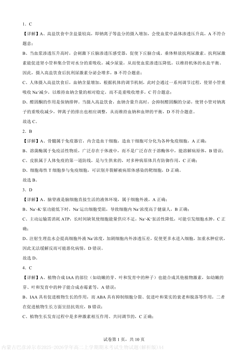 高二生物答案--内蒙古巴彦淖尔市2025-2026学年高二上学期期末考试