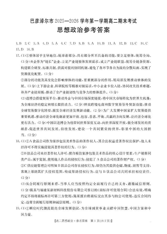 高二政治答案--内蒙古巴彦淖尔市2025-2026学年高二上学期期末考试