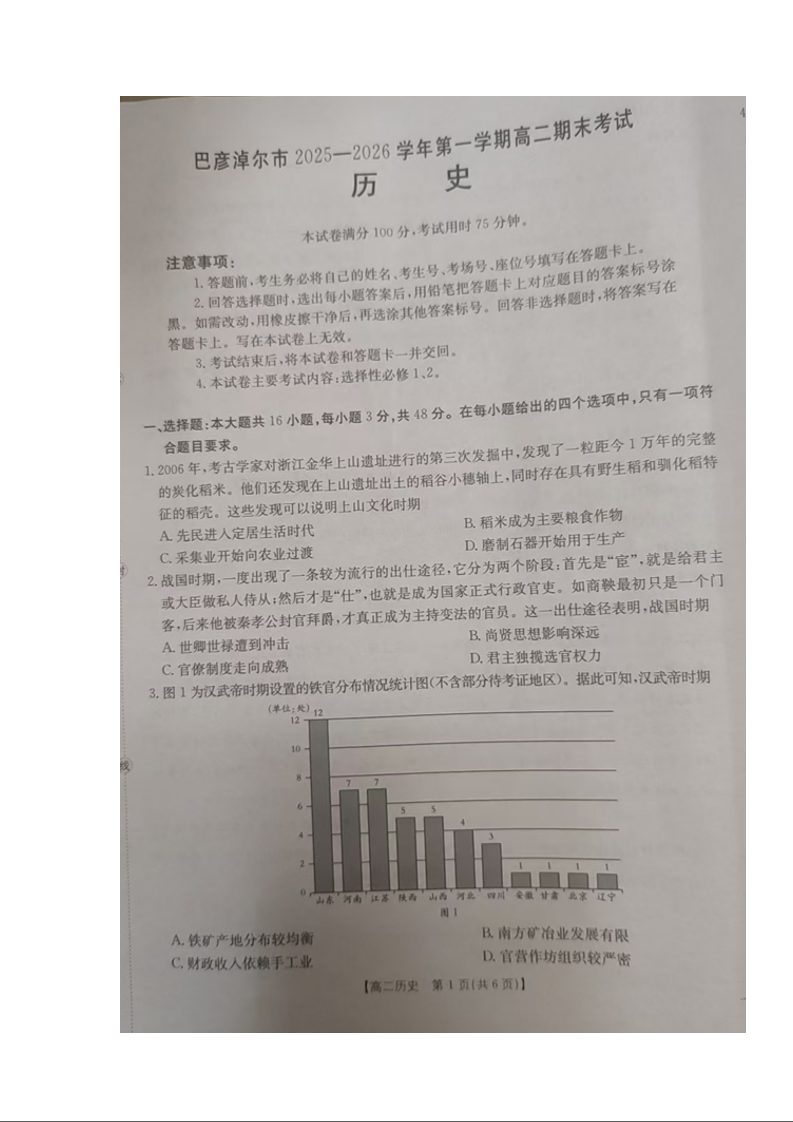 高二历史--内蒙古巴彦淖尔市2025-2026学年高二上学期期末考试
