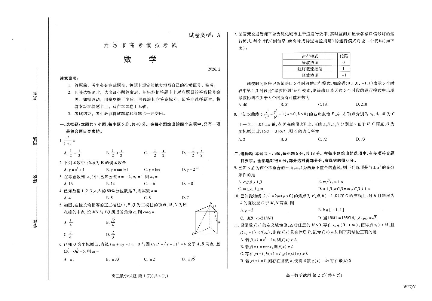 高三数学--山东省潍坊市2026.2高三模拟