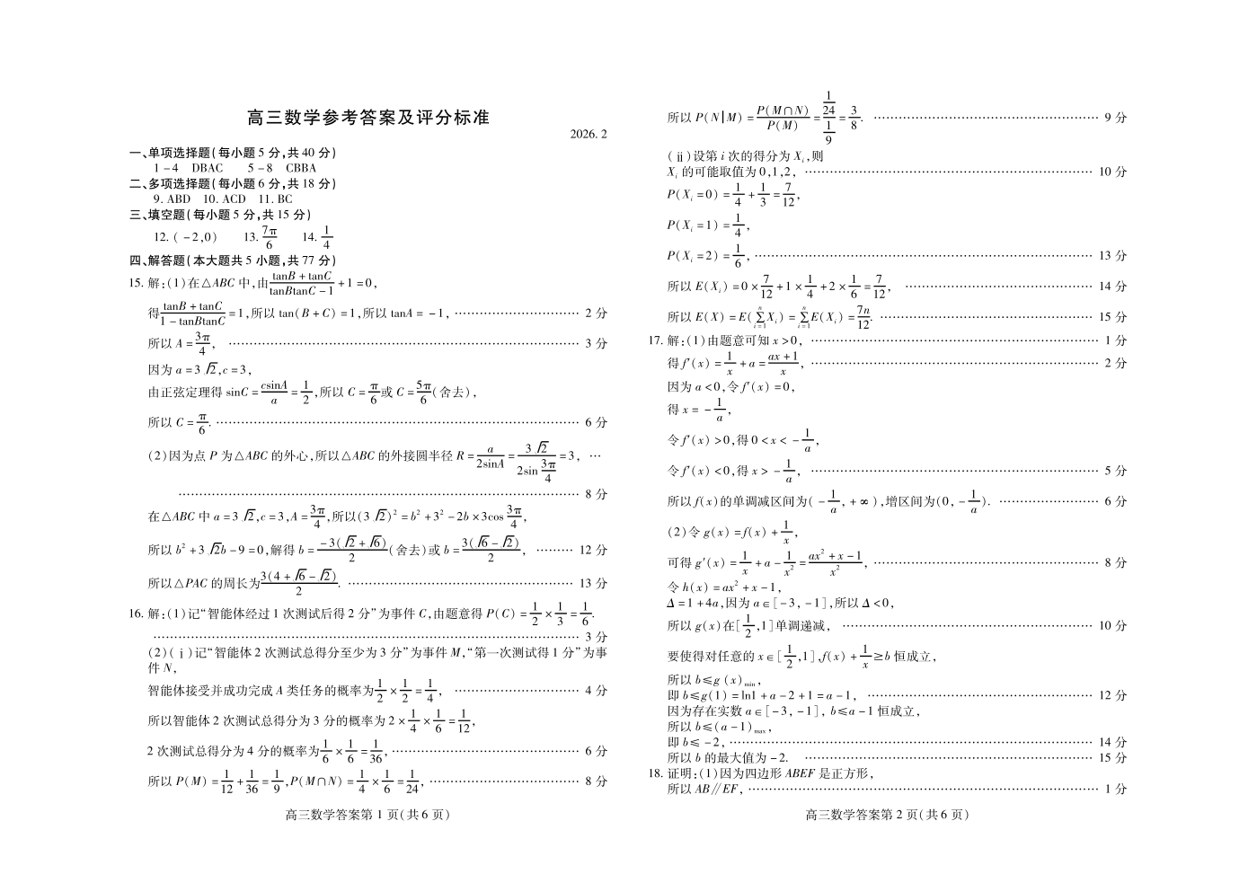 高三数学答案--山东省潍坊市2026.2高三模拟