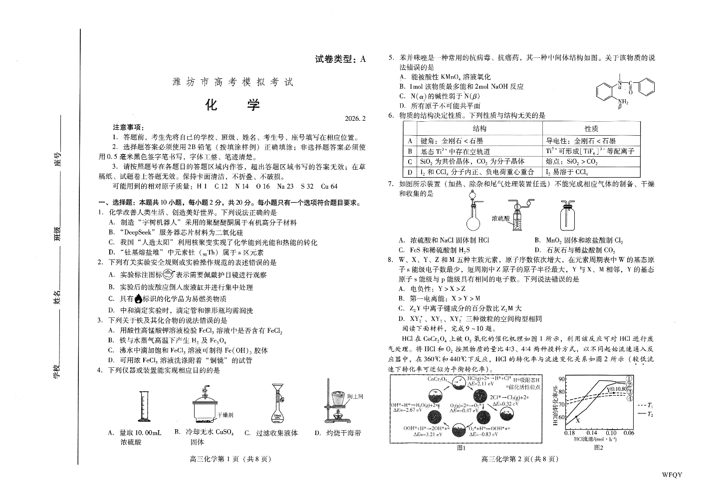 高三化学--山东省潍坊市2026.2高三模拟